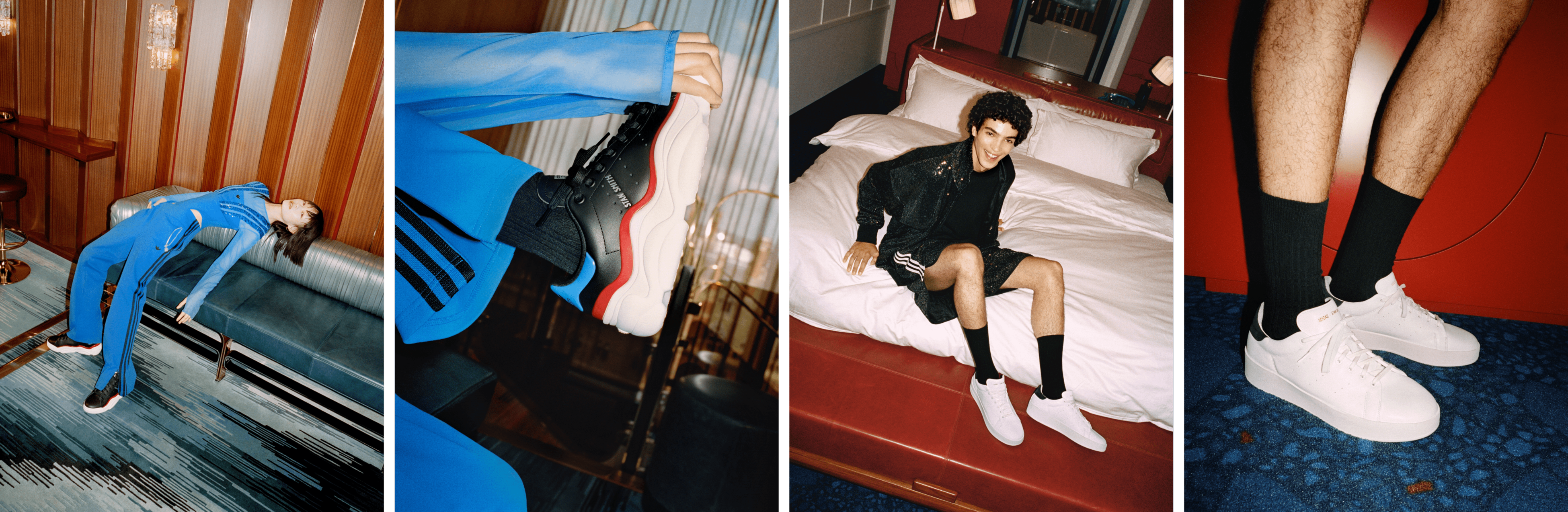 今季の「Blue Version」は、レトロなスタイルにインスピレーションを得た、ひねりの効いたアイテムが登場。際立つシルエットと意外性の富んだディテールで、タイムレスでクラシックな未来志向のステートメントピースへと進化。スパンコールをあしらったトラックトップやショートパンツ、アディダスのアイコンともいえるサンティアゴのカットラインから着想を得たボディスーツなどが登場します。