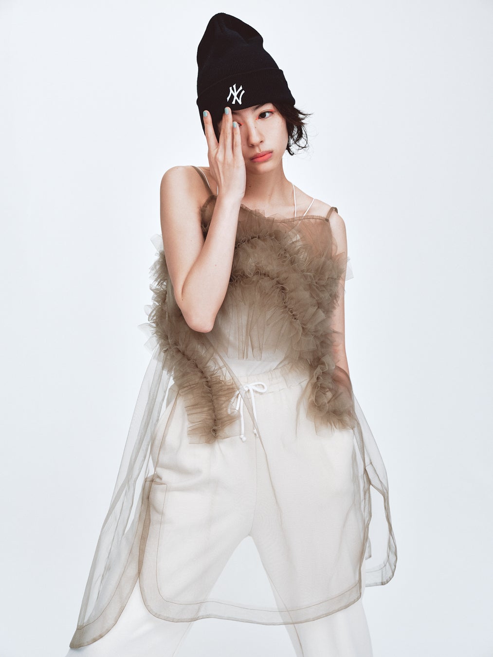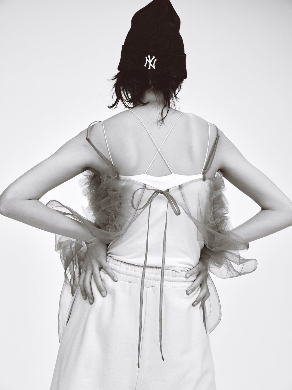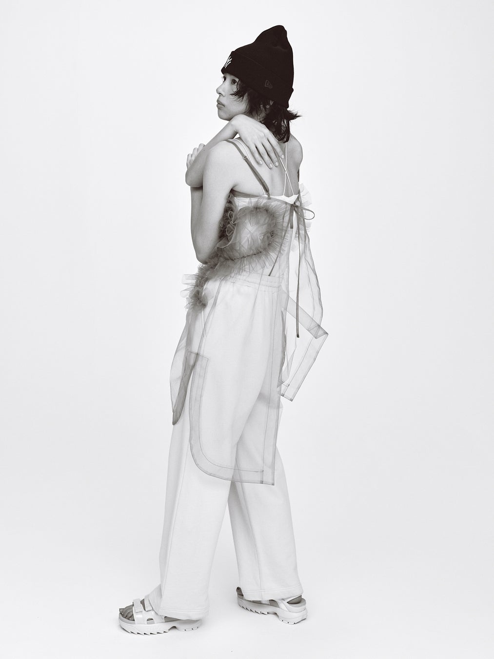 女性らしいエレガンスを表現する〈Chika Kisada〉からは、ハリのあるチュールを使った立体感のある『チュールワンピース』がラインナップ。スウェットパンツやニットキャップなど、意外な組み合わせで、チュールの透け感を際立たせたスタイリング。