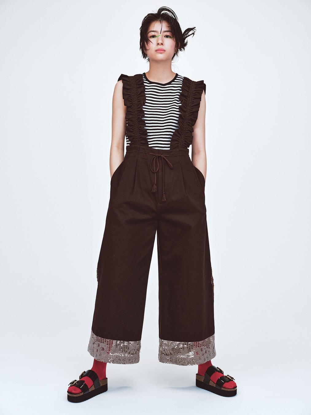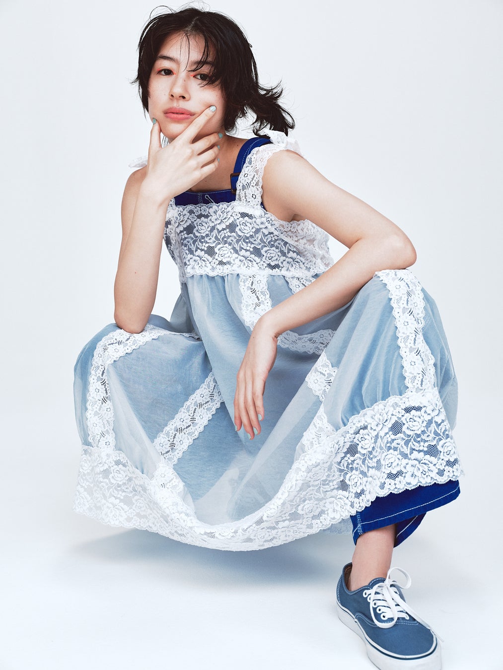 〈COMME des GARCONS(コムデギャルソン)〉のパタンナーを経てブランドを立ち上げた宮尾史郎が手掛けるファッションブランド〈MIYAO〉。ロマンティックなレースをふんだんに使った『シアーレースフリルワンピース』を着用し、繊細なギャザーや透け感を、あえて同系色のサロペットに重ねてカジュアルダウン。