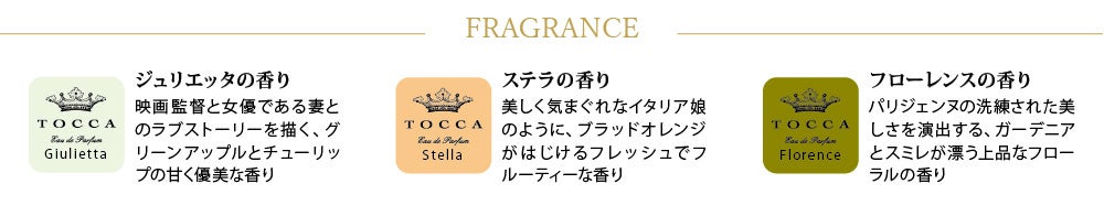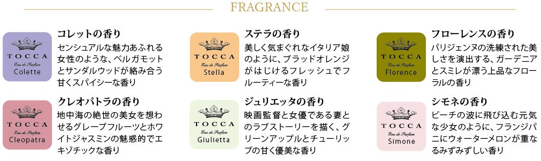 トッカならではの既成概念にとらわれない自由な発想は、「女性が美しくあるために」という共通項のもと、フレグランス・スキンケア・ランドリーといった既存のカテゴリーを超えた魅力的な製品たちを誕生させました。