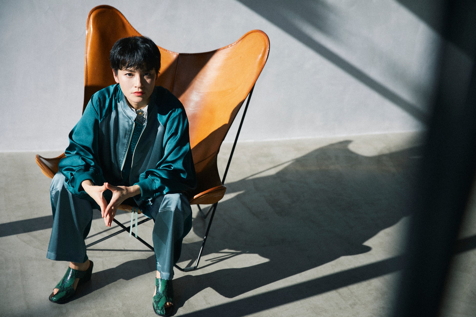 ご自宅でお洗濯できる天然素材と、柔らかなタッチのサテン系生地をミックスしたスタイリングもおすすめです。