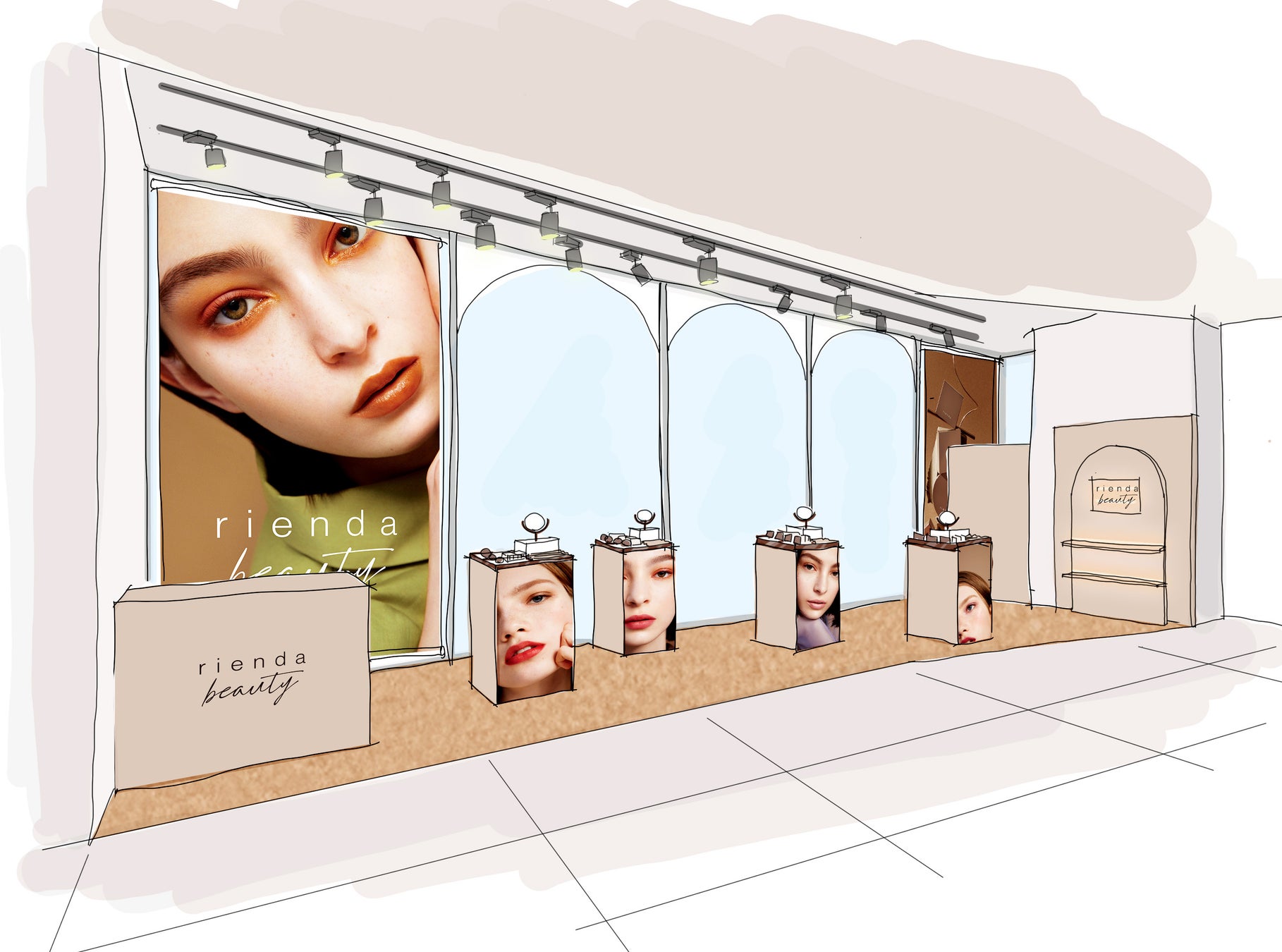 rienda beautyの世界観を表現した空間で、初めて商品を手に取ってお試しいただける場となります。
