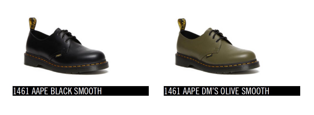 DR. MARTENS X AAPE BY *A BATHING APE® 発売日:2022年9月16日(金) (ドクターマーチン公式オンラインショップはAM8時〜) アイテム: 1461 AAPE 3ホールシューズ プライス: 各 ¥25,300 (税込) サイズ展開: UK 4- 10 カラー展開: BLACK / OLIVE 取り扱店舗: ドクターマーチン公式オンラインショップ、 Showroom TYO、AAPE取扱店舗 |