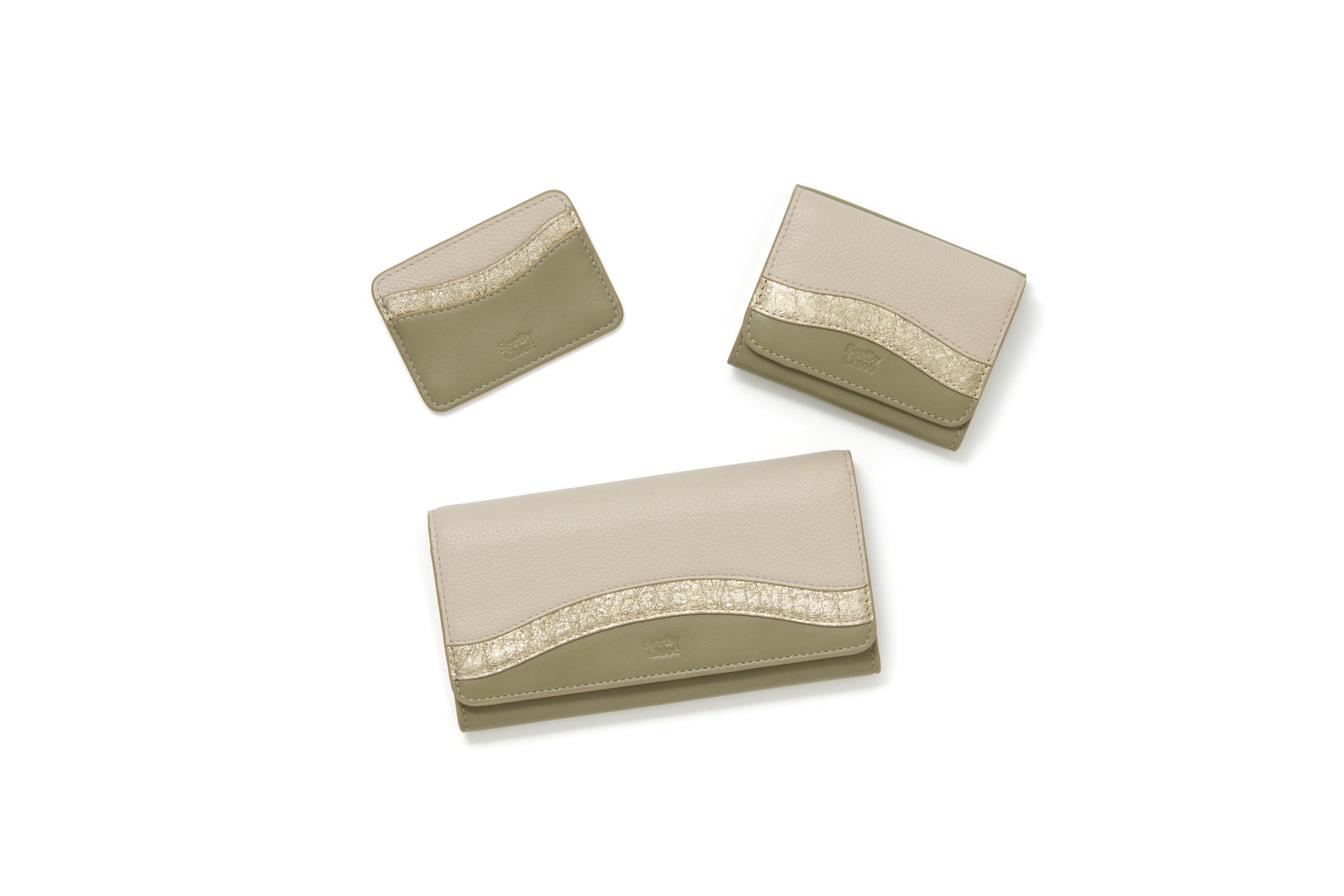 MARAコレクションと同じく、ポッタリーグリーンにペールゴールド、セメントベージュというソフトでフェミニンなカラーパレットで展開されるのは、LAYERSコレクションのスモールレザーグッズです。曲線的なラインとカラー ブロックが特徴のLAYERSコレクションには、レザーワーキンググループ認証のレザーが用いられ、ロングウォレット、ミディアムトリフォールドウォレット、カードホルダーの3型が揃います。
