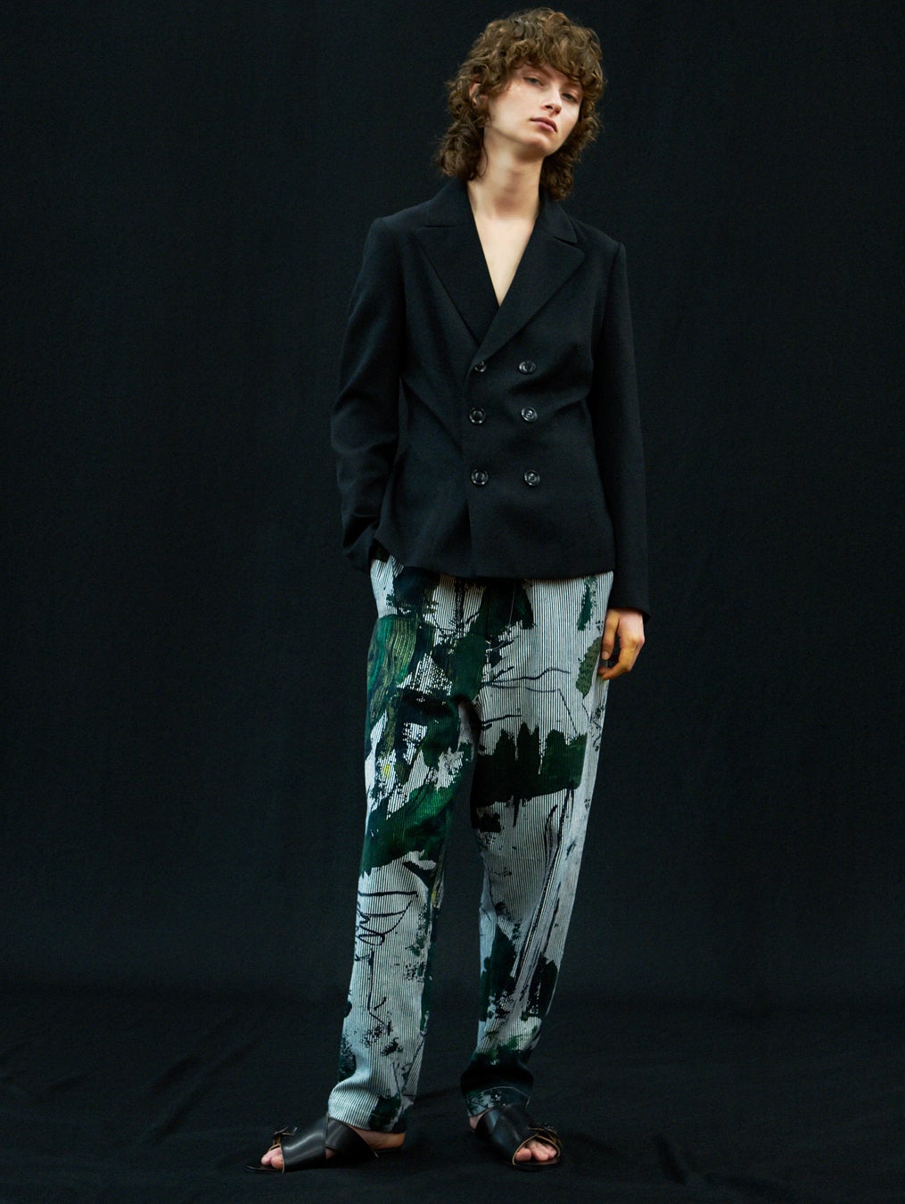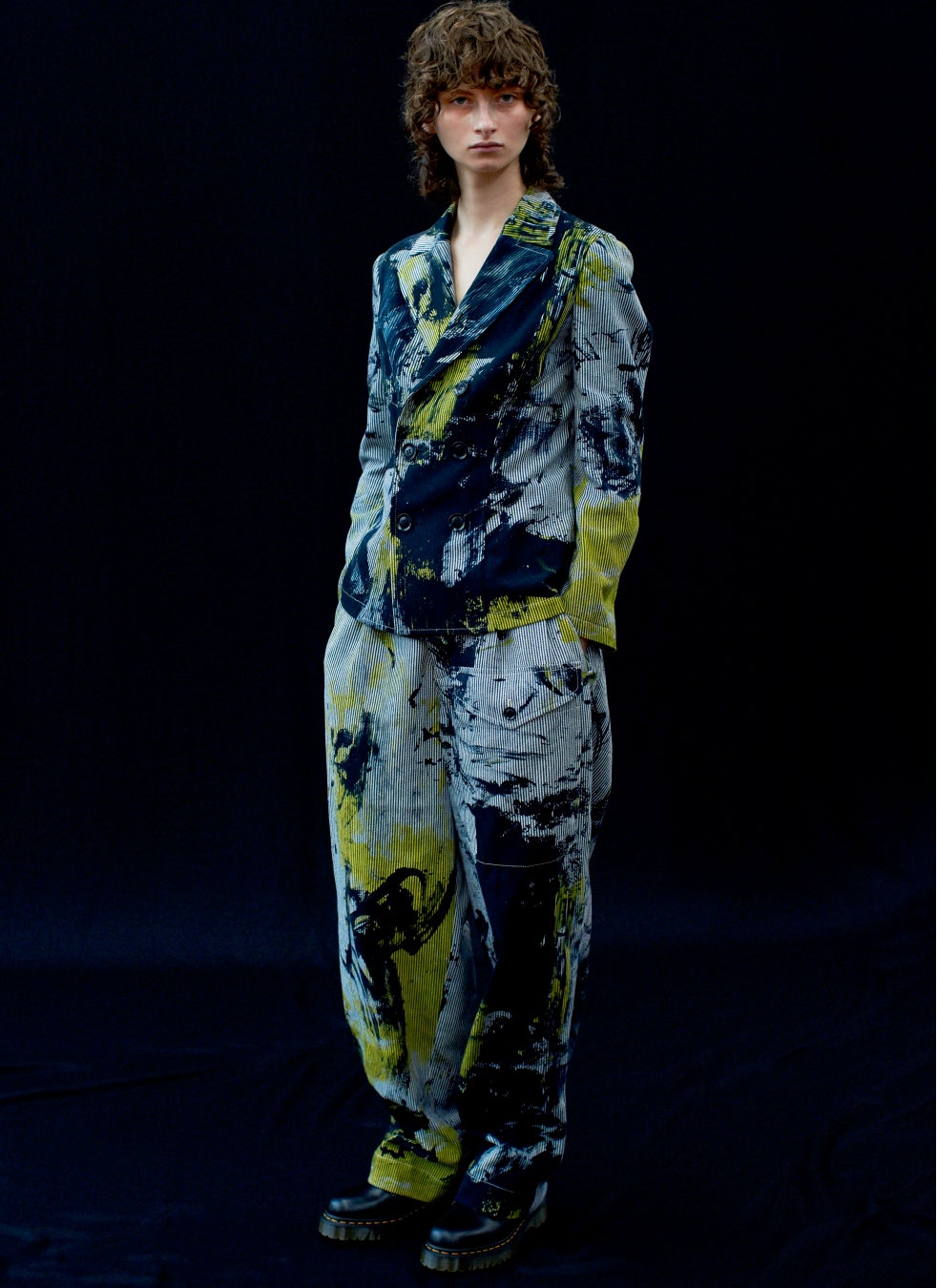 ワークウエアの代名詞のようなインディゴに太めの白い線が入ったヒッコリーデニムでつくる、女性の身体に焦点をあててつくられたウエストシェイプしたダブルブレスト・スリムジャケット、ミリタリーパンツが着想源のメンズライクなパンツ。コレクションのために描かれた画家・朝倉優佳の実寸大のペインティングワークが、原画の鮮やかな色合いのまま、ヒッコリーデニムと自然に馴染む。ワークウェア、フェミニニティの表現、レディライクなジャケットに組み合わされた男性服の要素など、Y’sらしさと今シーズンのテーマ性が詰め込まれたような2023春夏のシグネチャールック。