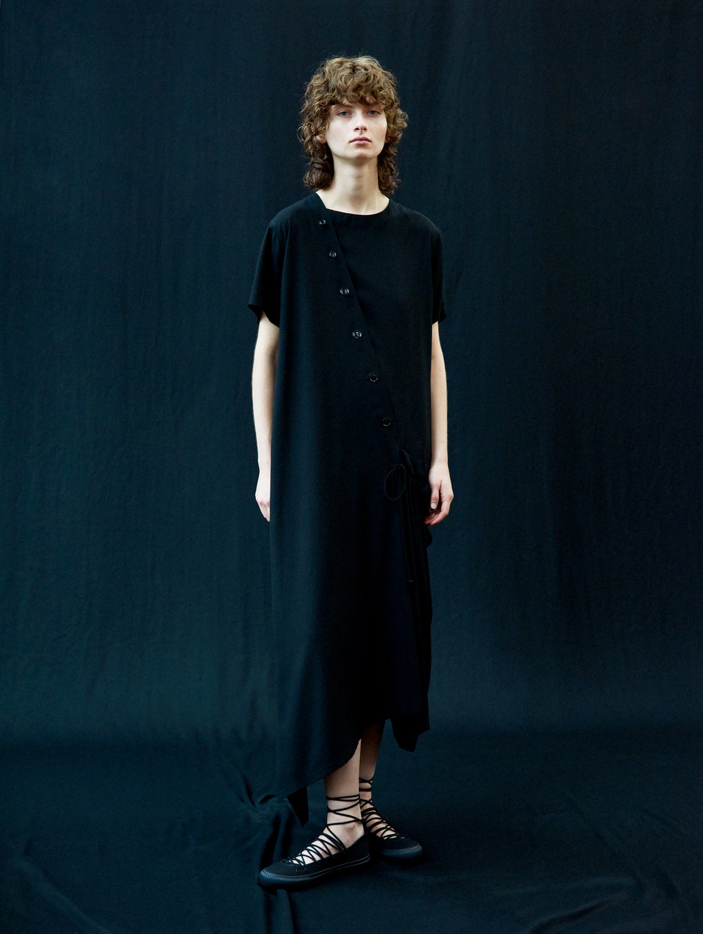 アシンメトリードレス。ボタンやギャザーが着易く軽いドレスに、ユニークな視点を与える。