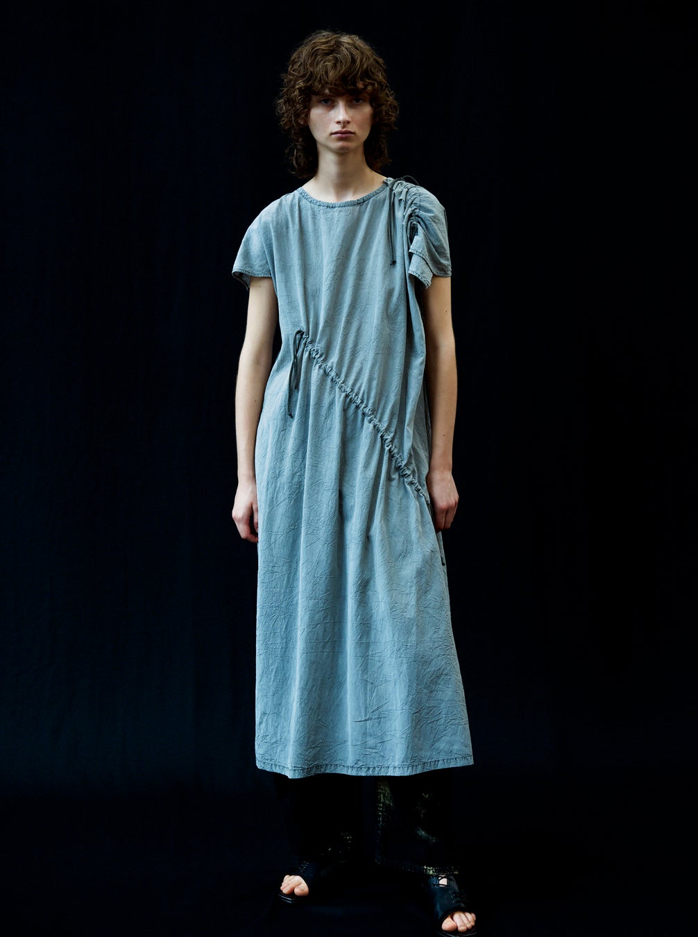 アシンメトリーに構成されたギャザーがユニークなフォルムを生むドレス。分量のある身頃を紐で寄せることで裾がひらひらと波打ち、奥行きのあるシルエット、特有の表情が生まれる。