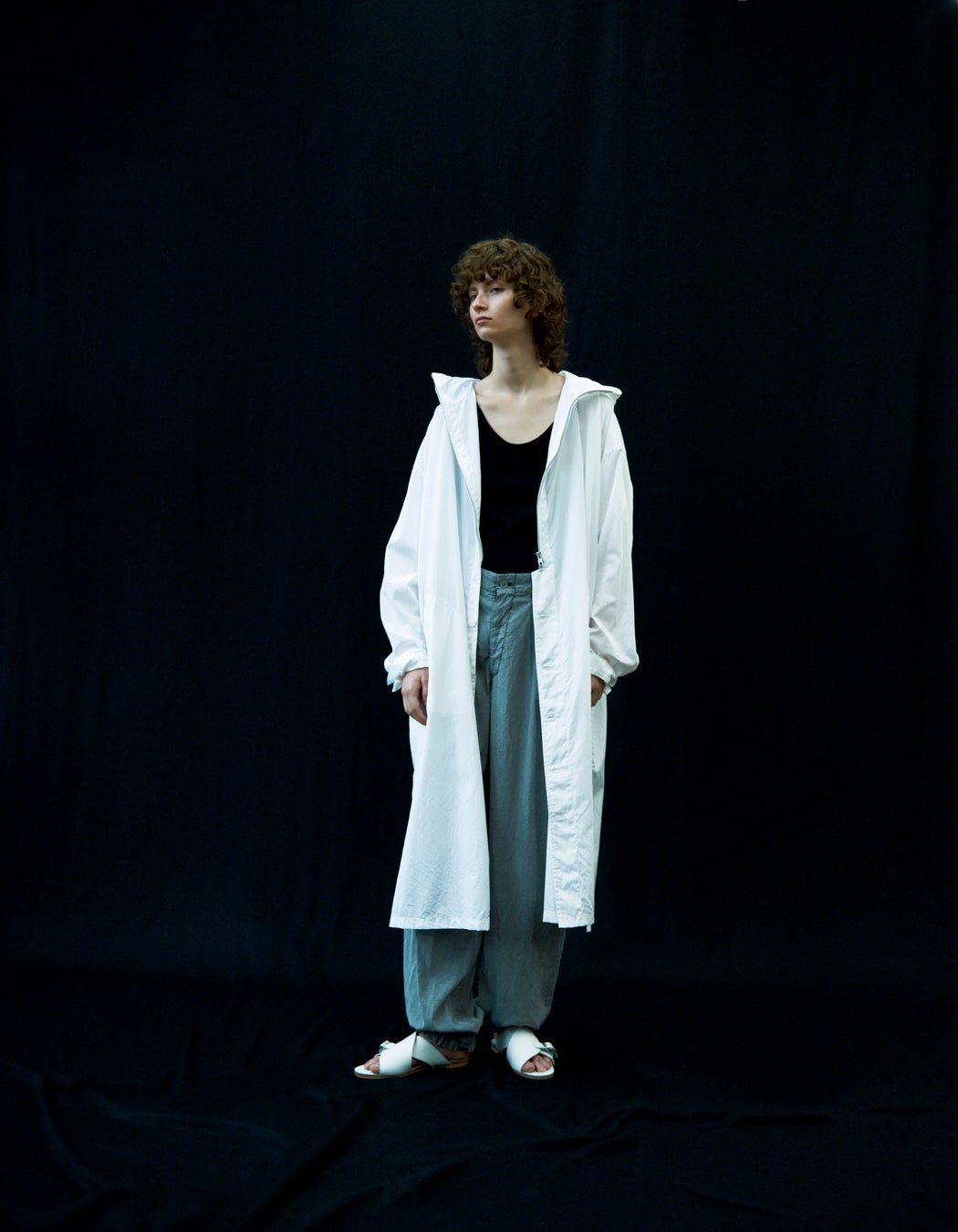 コットンブロードでつくられたアノラックパーカーの様なフード付きのジップアップコート、着慣れた風合いのパンツ。男性的なラフなスタイルに、シャツ生地のおおらかな表情や、柔らかなパンツの余裕のある風合いが、どこか女性らしい佇まいを加える。