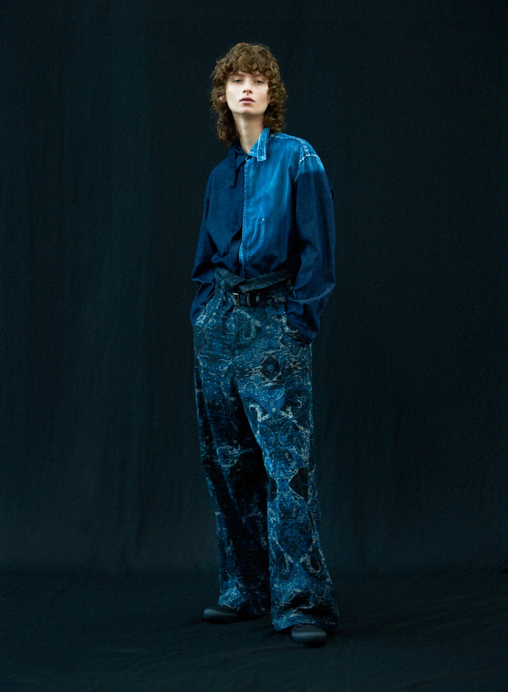 ブルーのレイヤード。インドで織られたアンティーク柄のジャカードをスキャンしプリントした共布ベルト付きハイウエストパンツ。裏面が表に使われたジャカード生地は、白黒の糸で織られたダンガリーを下地に使うことで柄に奥行きが生まれ、表情豊かなシルエットをつくる。パンツはウエストヨーク部にサスペンダー用のボタン付き。