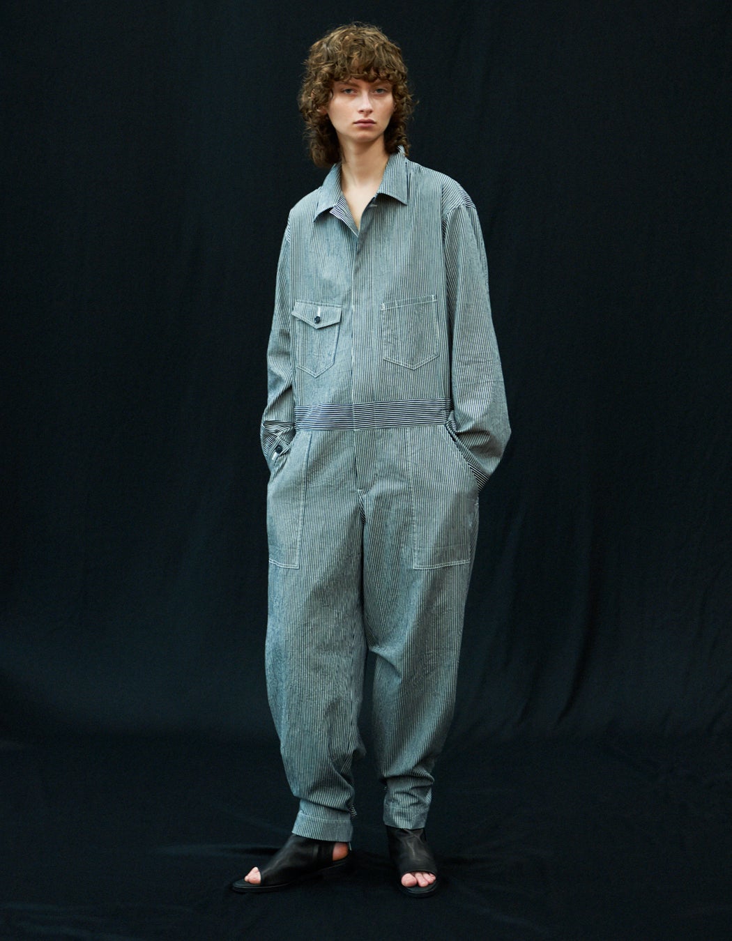 インディゴと生成を組み合わせたヒッコリーデニムのジャンプスーツ。ワークウェアらしいフォルムと作業着本来の動きやすさを保ちつつ、女性の身体に緩やかに沿いながらストンと落ちるシルエット。裾に配されたタブで裾幅を絞り丈を短くすると、重心が上になり、軽い着こなしに。