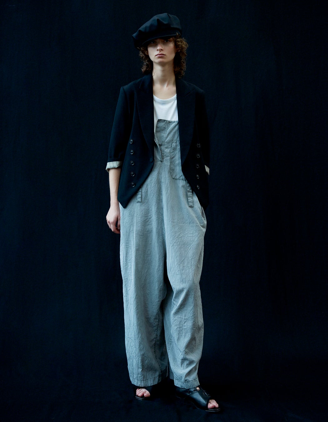着慣れた風合いの、たっぷりとした分量の布を肩紐で吊るしたようなオーバーオール。要素を抑え、生地そのものが生むフォルムをいかすように仕立てることで、男性服に由来するアイテムが柔らかな印象に仕上がる。