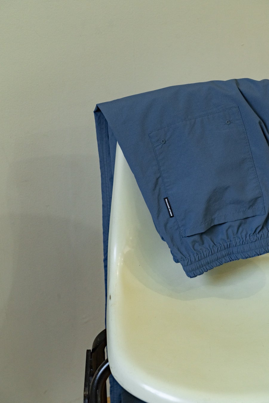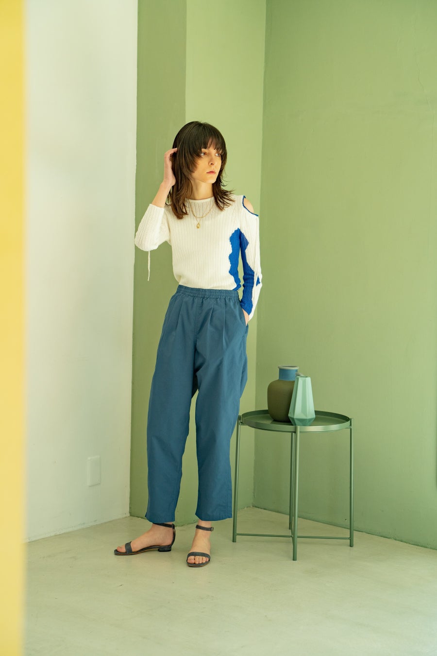 ネイビーのような感覚で合わせやすいブルーのトラックパンツには、ショルダー部分がカットオフされた〈of HANDMADE〉のニットを合わせ、爽やかなスタイルにひとさじのスパイスを。青を効かせたワントーンでまとめて、統一感のあるコーディネートに仕上げて。