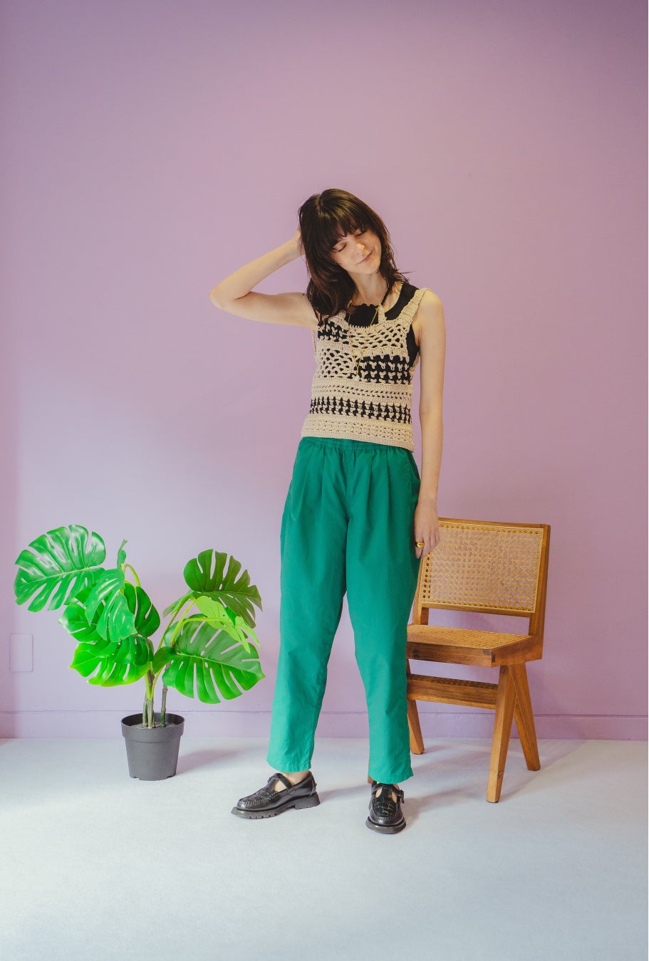 春夏シーズンで流行間違いなしのクロシェニットトップス。グリーンのトラックパンツを合わせて、爽やかな日差しに映えそうなコーディネートにまとめて。インナーやシューズには、ブラックを取り入れて、スタイリングの引き締め役に。足もとはあえて重たいローファーで遊び心をプラス。