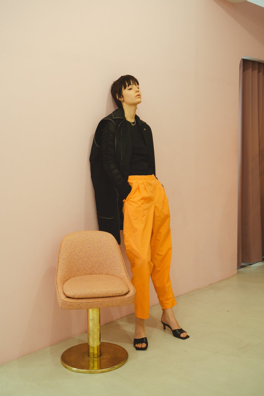 トレンドで注目のビタミンカラー、オレンジ。トップスには、ブラックを組み合わせてメリハリのあるスタイルにまとめたい。〈WILD THINGS×Yoshimi Nagao〉ベストには〈PROVOKE〉のシアートップスをレイヤードして、異素材同士のブラックが奏でるAresenseらしいモードな雰囲気を楽しんで。