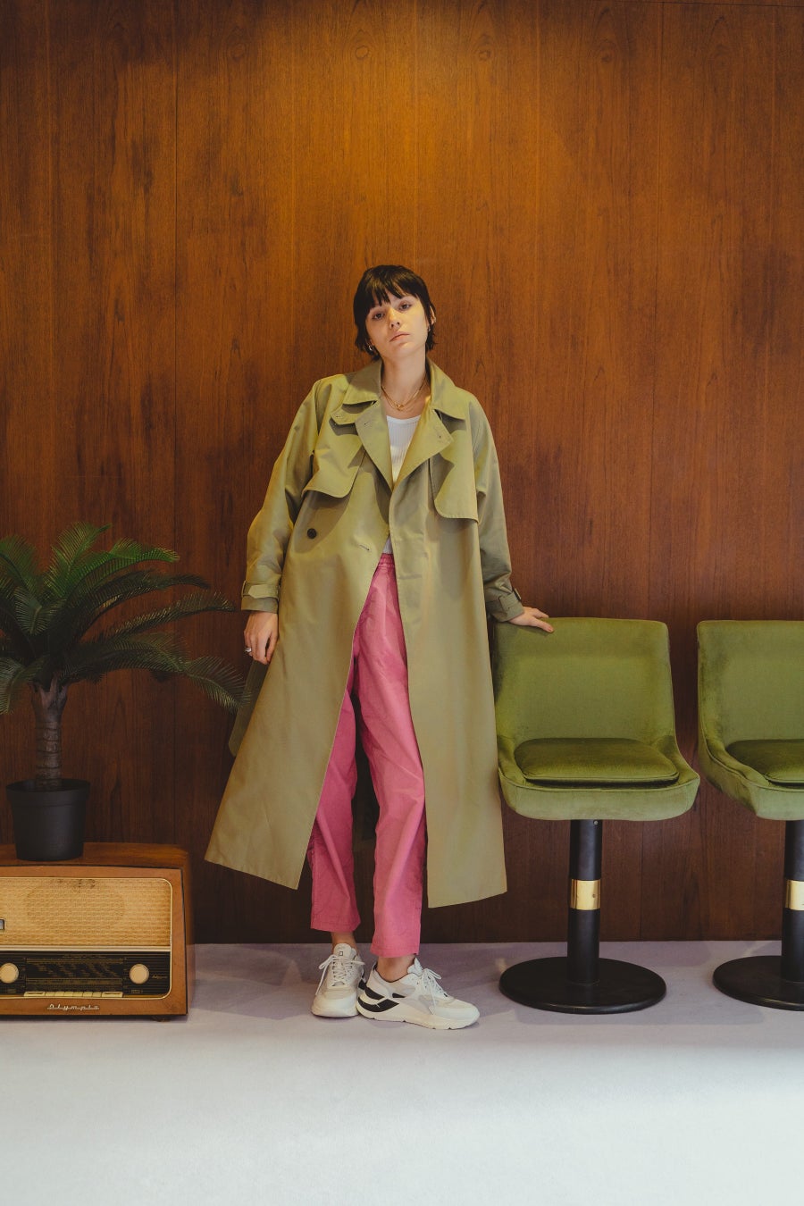 ビビットなピンクのトラックパンツは、コーディネートの主役となりそうな存在感。定番のアイテムである〈Aresence〉のトレンチコートを羽織って、冬から春の空気へと徐々にシフト。カジュアルなアイテムにオーセンティックなアウターとのバランスが、着こなしの可能性を広げてくれる。