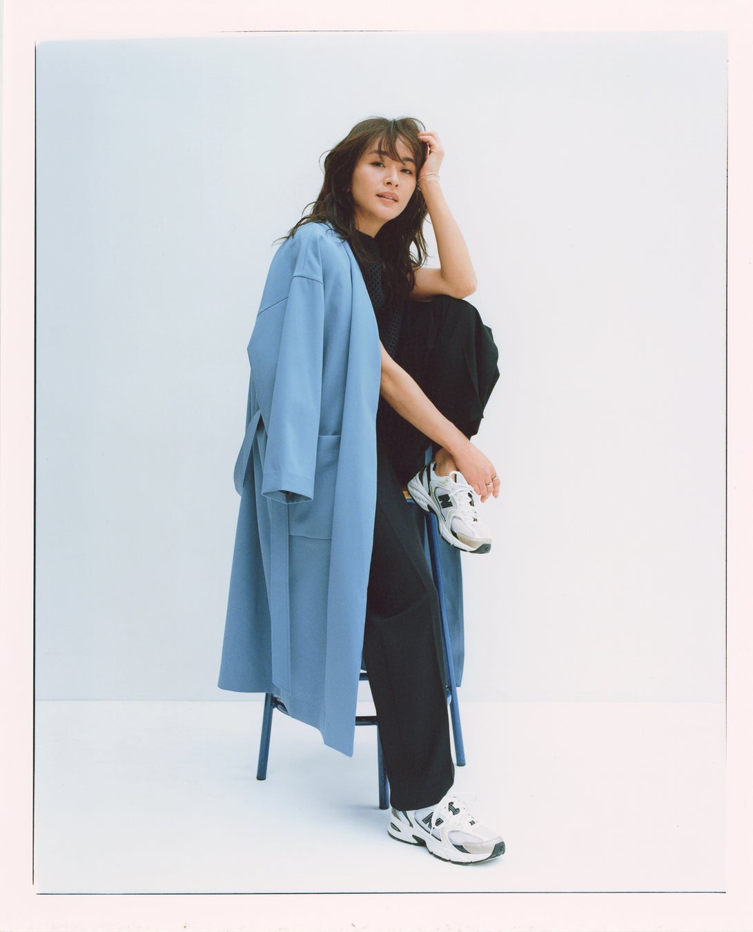emmiのコンセプトであるクリアモードをイメージさせる、春らしいオリーブカラーをチョイスしたBeniさん。肩の力を抜いたリラックスムードが今っぽい。