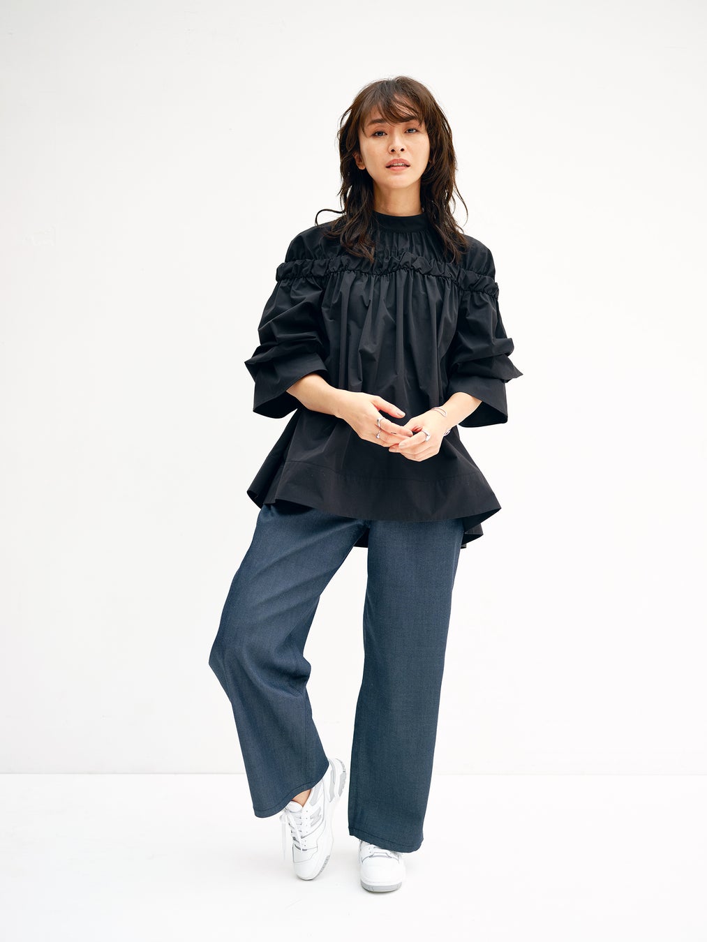 おしゃれ感度の高いブラウスをあえてタックインしない着こなしで、リラクシーなモードスタイルに仕上げた佳子さん。