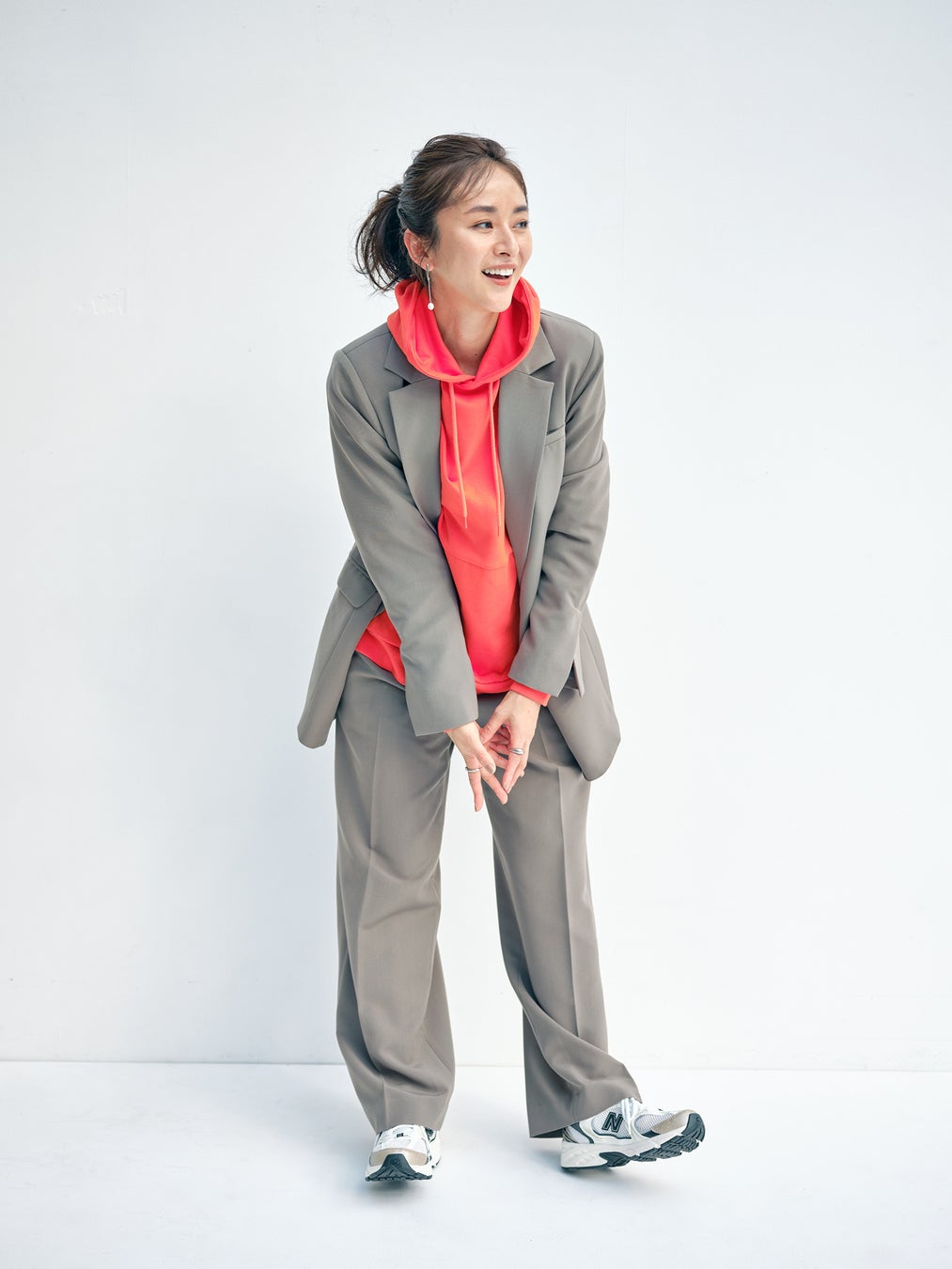 シックなセットアップスーツを合わせることで、フーディーの主役感がより一層引き立ちます。