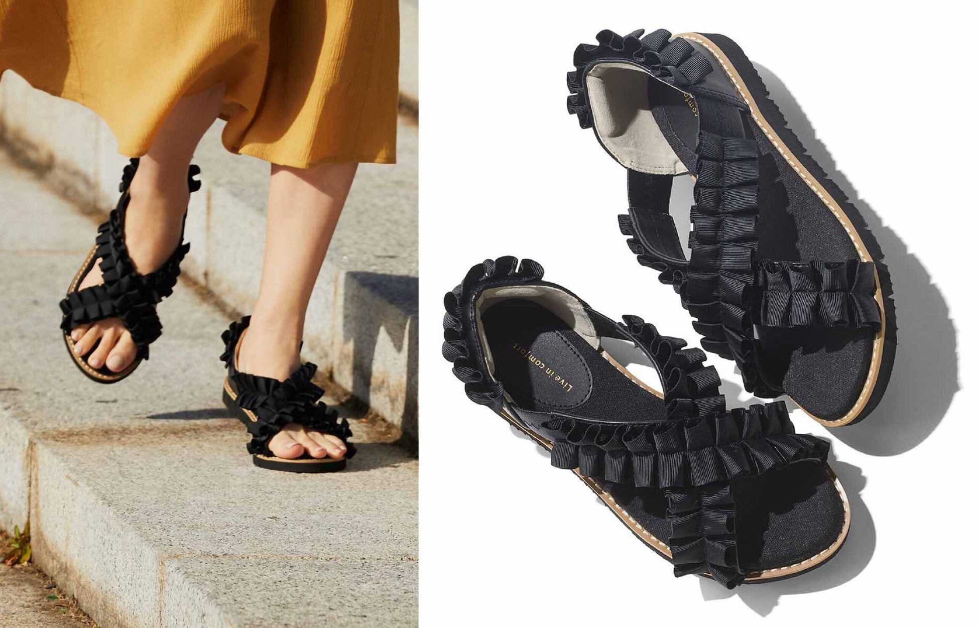 お客様のリクエストを受け、以前発売したフリルサンダルに改良を加えて復刻しました。新機能として、“手を使わず、すぽっとはける”ように設計し、甲バンドのクロス位置を調整し足のホールド力を上げています。見た目をきれいに見せるため、フリルデザインもリニューアル、大人かわいいデザインは、さまざまなコーディネートで活用できます。