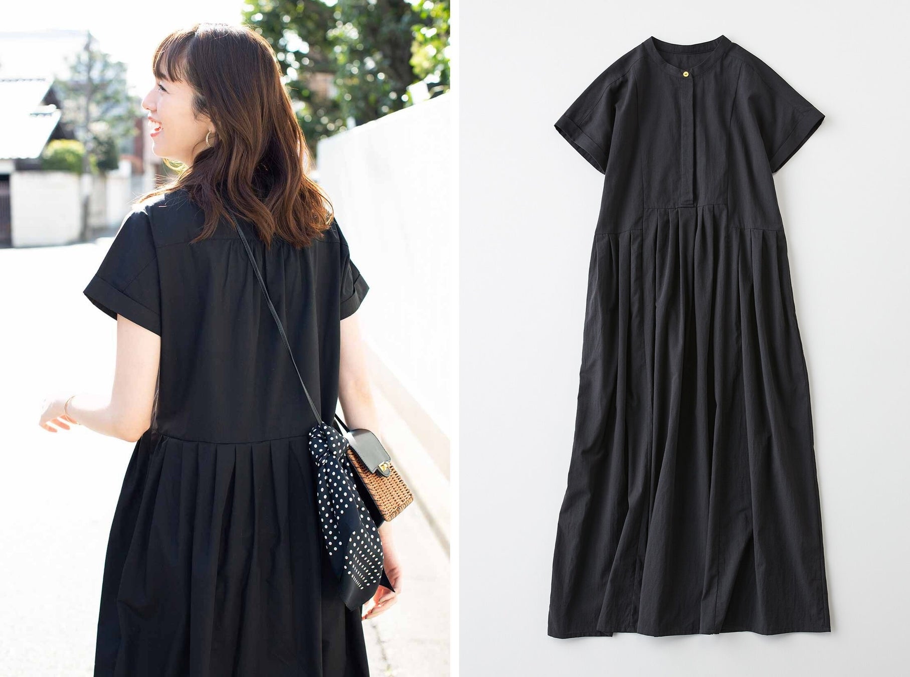 佐藤栞里さんとLive in comfortのコラボ企画第15弾の、涼やかな黒いワンピースです。綿混の涼やかな素材に、シルエットやデザインには、ギャザーや切り替えの工夫が凝らすことで、夏にぴったりの軽やかさとスタイルアップ効果を備えています。シューズや小物によって印象が大きく変わり、自由にコーディネートを楽しめるため、あらゆるシチュエーションで好感度を高めます。