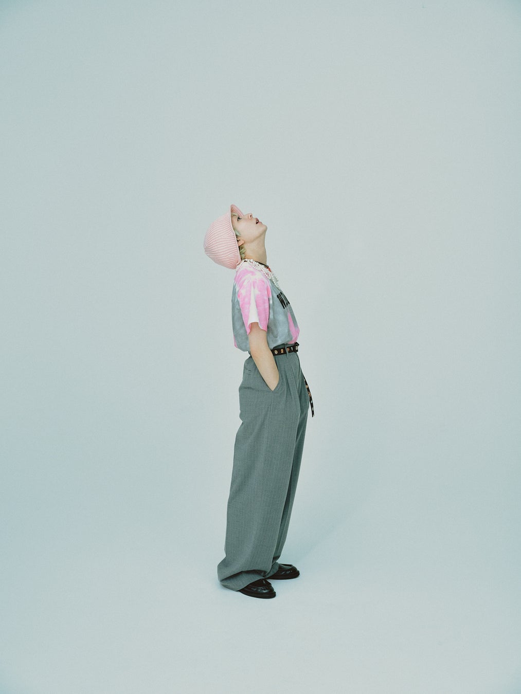 着用アイテムは、グレーとピンクの渦巻いたタイダイ柄に、ブランドを象徴するプリントが目を惹く一着。ピンクを差し色にしたグレーコーディネートには、ハートのネックレスやドッグ柄のベルトなど、キャッチーな小物で大人の遊び心をプラスしています。