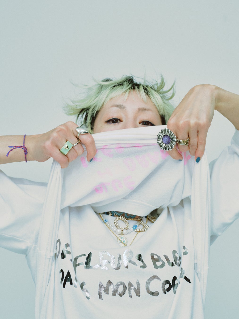 レイヤードしている箔プリントの『ブルーフラワーTシャツ』は、青い花=幸福を隠喩し、“DES FLEURS BLEUES DANS MON COEUR(心に青い花があるということは幸せは心にある)”という英文となっている。