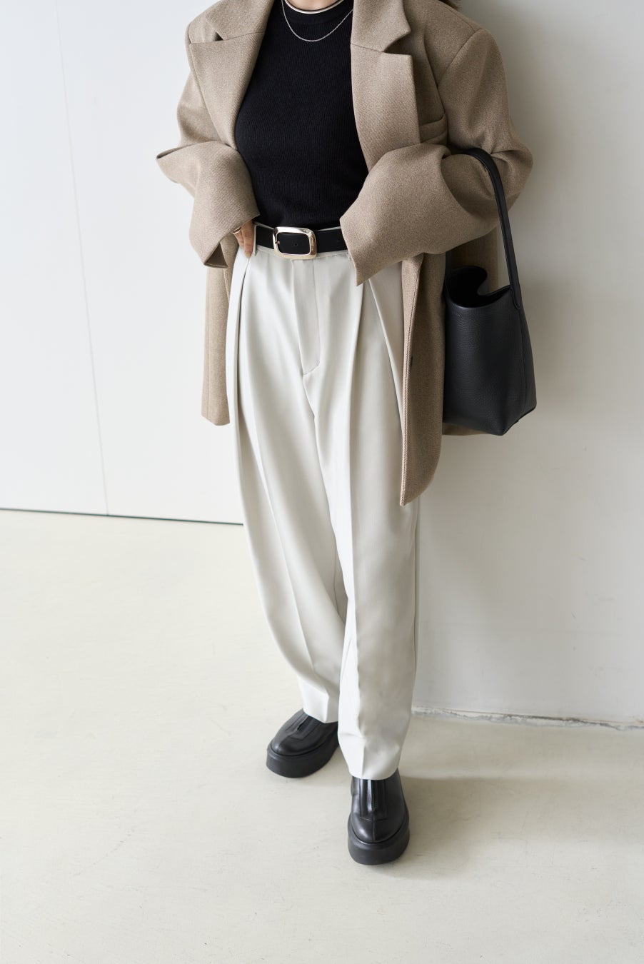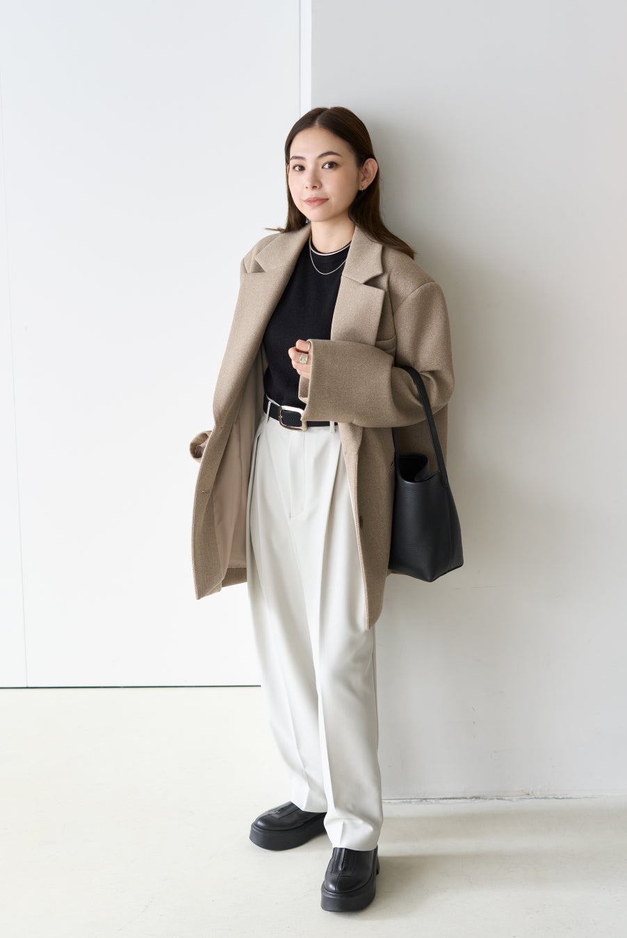 正統派なスラックスの印象をメンズライクなオーバーサイズのジャケットで着崩した、私の大好きなスタイリングです。ベルトでウエストマークをすることで、腰位置をより高く見せてスタイルアップを狙いました。