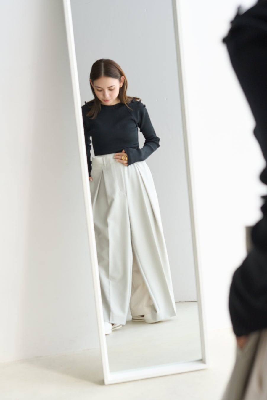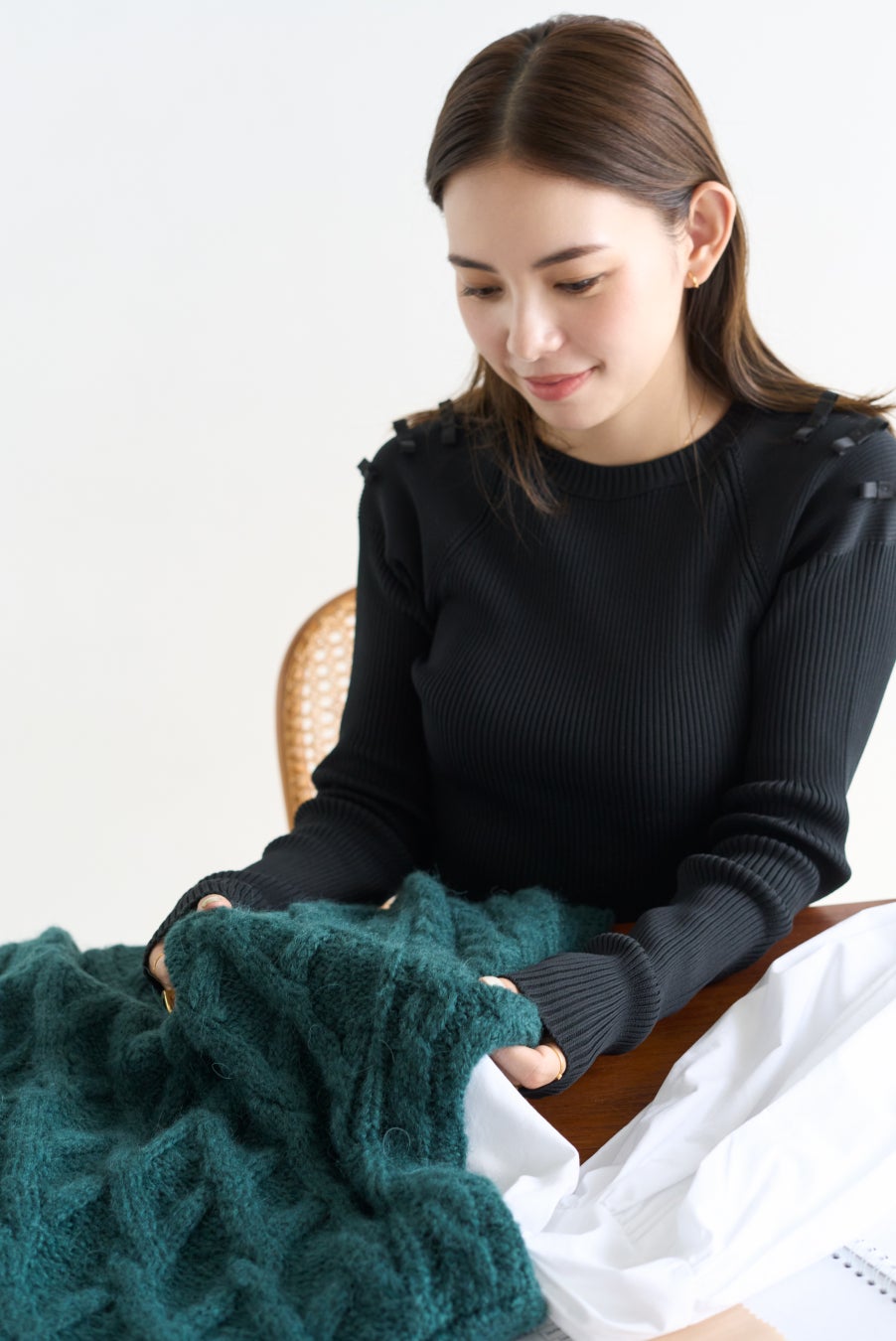 Mila Owen展示会の際に、このトップスを着用したメインビジュアルを見て、一目惚れしました。「大人っぽく色物を楽しみたい!」という想いで“モスグリーン”をチョイス。
